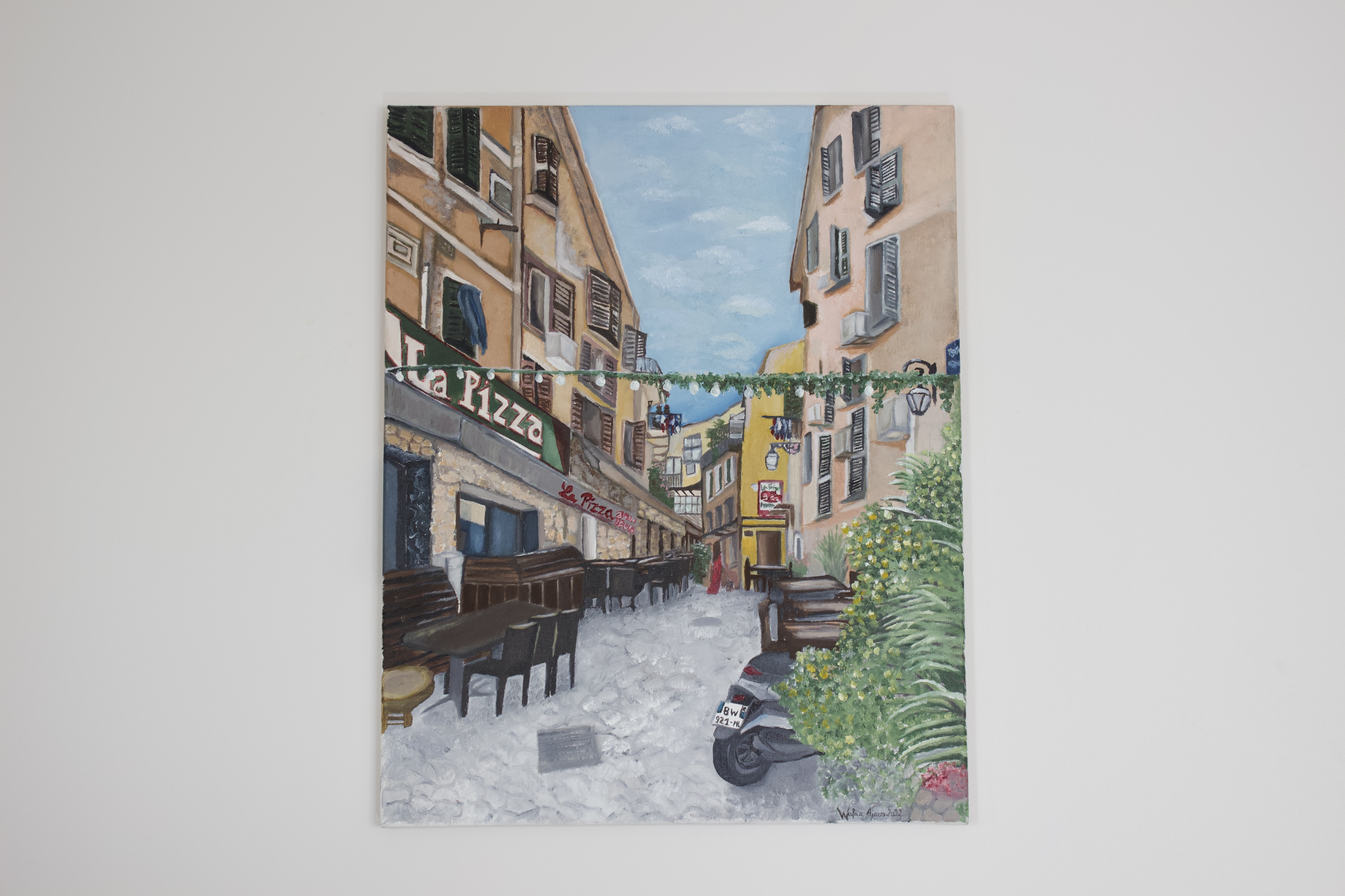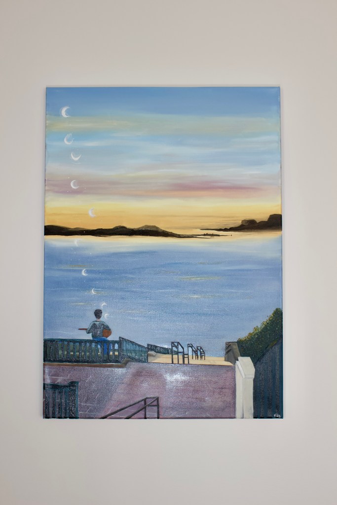 « Bleu, ciel » est une série de peintures explorant les multiples nuances du bleu, telles qu’elles s’inscrivent dans les paysages et mes souvenirs. Cette couleur, vaste et évocatrice, appelle à l’immensité des horizons : le ciel infini, la mer en mouvement… La virgule du titre suggère qu’elle peut symboliser bien plus encore.